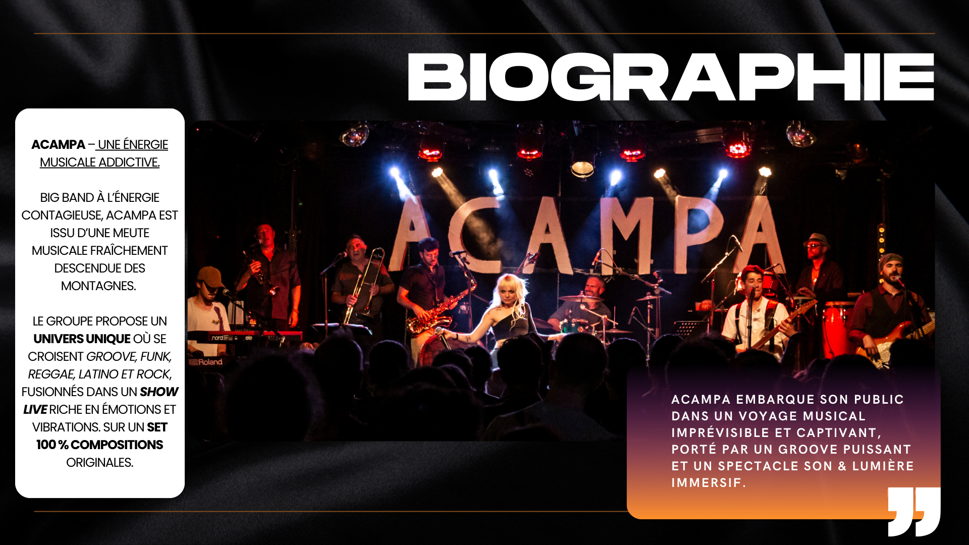Plein de surprises, d’émotions et de bonnes vibrations. Le big band vous emmène là où vous ne vous attendez pas. De la funk ? Oui mais pas que… Les influences sont multiples, du reggae au latino en passant par le rock, Acampa fusionne les styles au service d’une passion : le Groove !